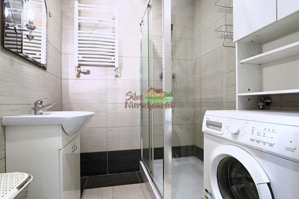 Łazienka: prysznic, umywalka, szafka, lustro, WC oraz pralka